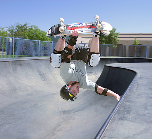 Much more than a champion flatland freestyler, Robertson excels in all terrain with classic old school style – with hand on coping, Doc pulls a backside invert at Carolina Skatepark.